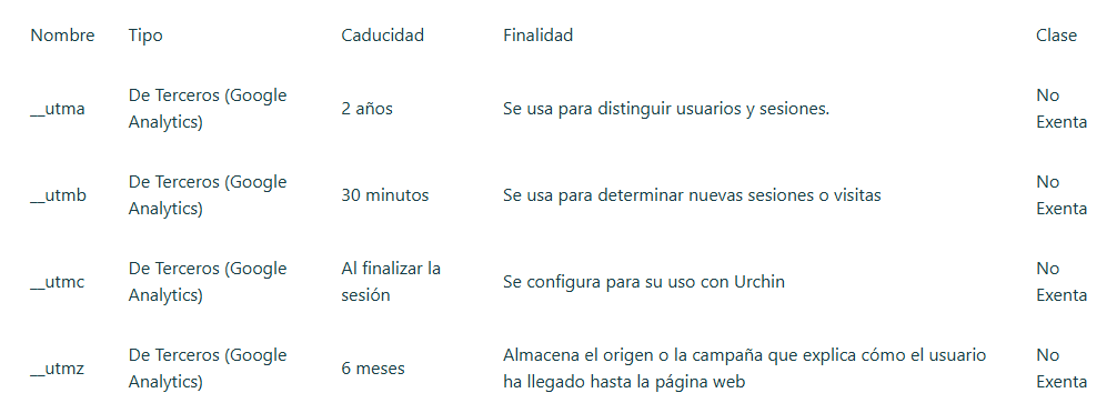 Cómo usa Google Analytics las cookies: https://developers.google.com/analytics/devguides/collection/analyticsjs/cookie-usage?hl=es#analyticsjs